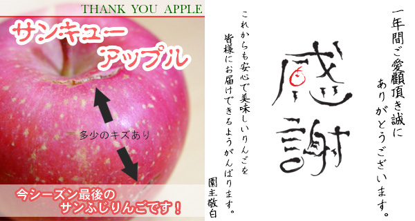 サンキューアップルは1年間ご愛顧頂きました感謝の意をこめてお届けする今シーズン最後のサンふじりんごです。ふぞろいのりんごの為、多少の色むら、少し形が悪いものや微々たる傷等もあったりしますが、ご家族の皆様でお召し上がり下さい。